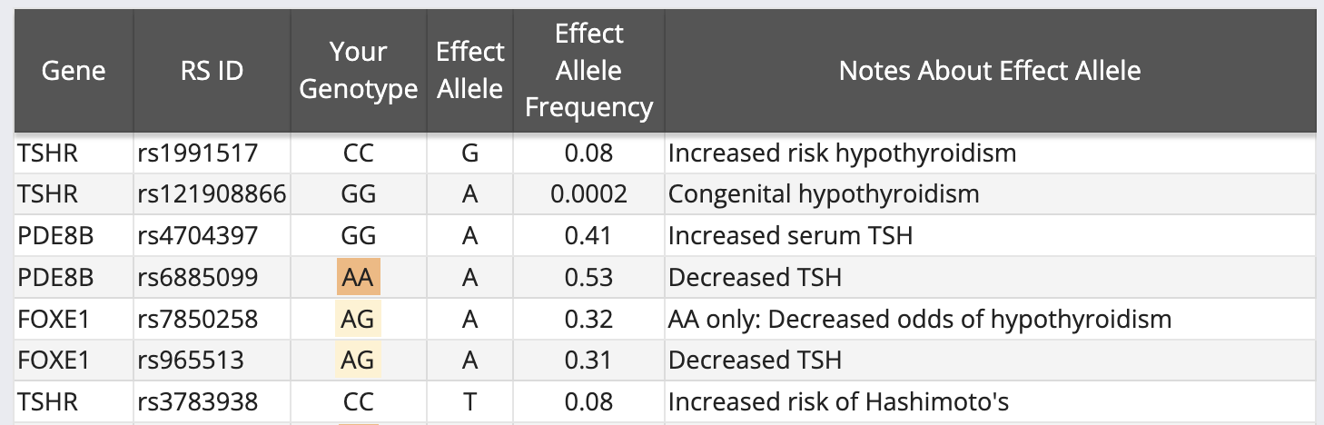 - An orange highlight indicates that your genotype matches two copies of the effect allele (homozygous).