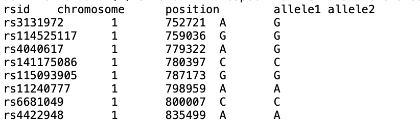 AncestryDNA uses a slightly different format but contains the same essential information. For AncestryDNA, the genotype is broken into two columns, referred to as allele 1 and allele 2